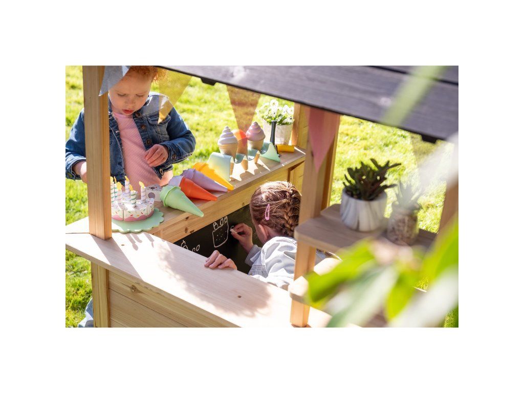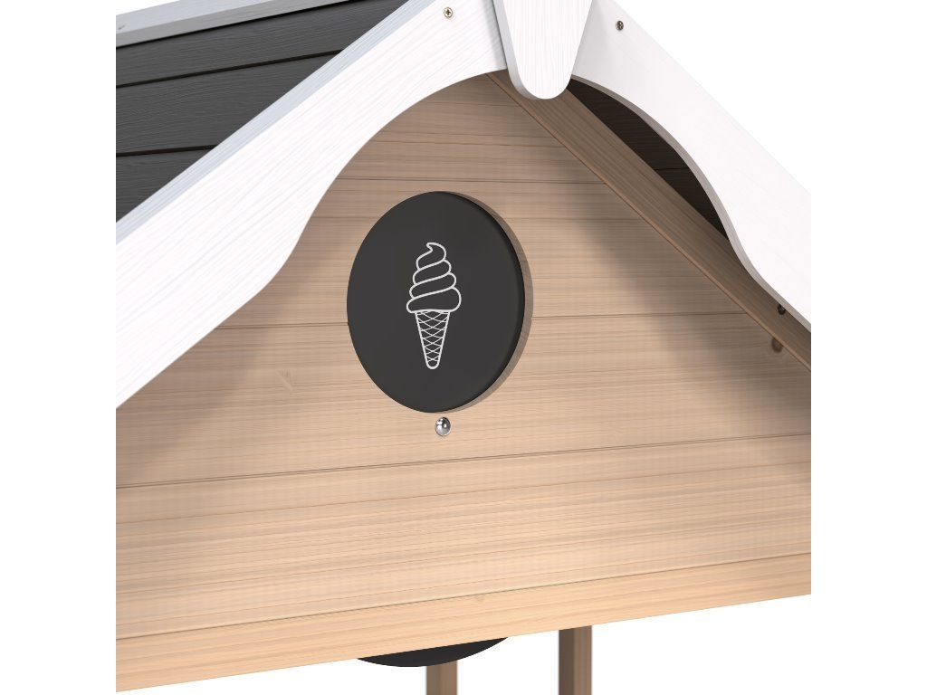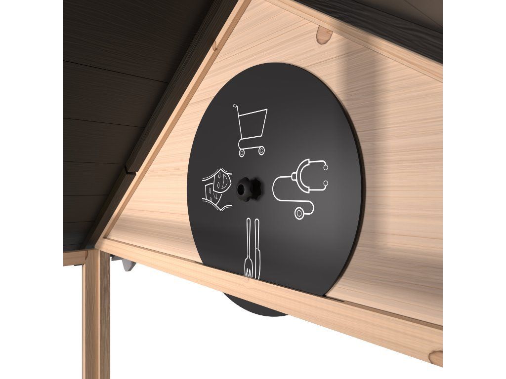 V prednej hornej časti záhradného domčeka sa nachádza jedinečné koliesko na určenie 8 druhou tém, na ktoré sa máte práve chuť zahrať ako je napr: obchod, doktor, reštaurácia alebo divadlo. Keď obrátite toto koliesko, uvidíte šalšie témy a tento drevený domček tak môžete premeniť na stánok so zmrzlinou, hrad, veterinárnu ambulanciu alebo policajnú stanicu. Možnosti sú nekonečné!