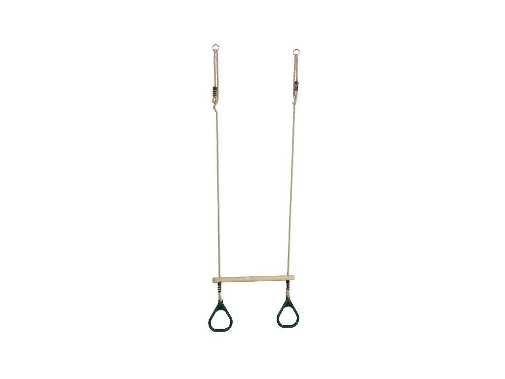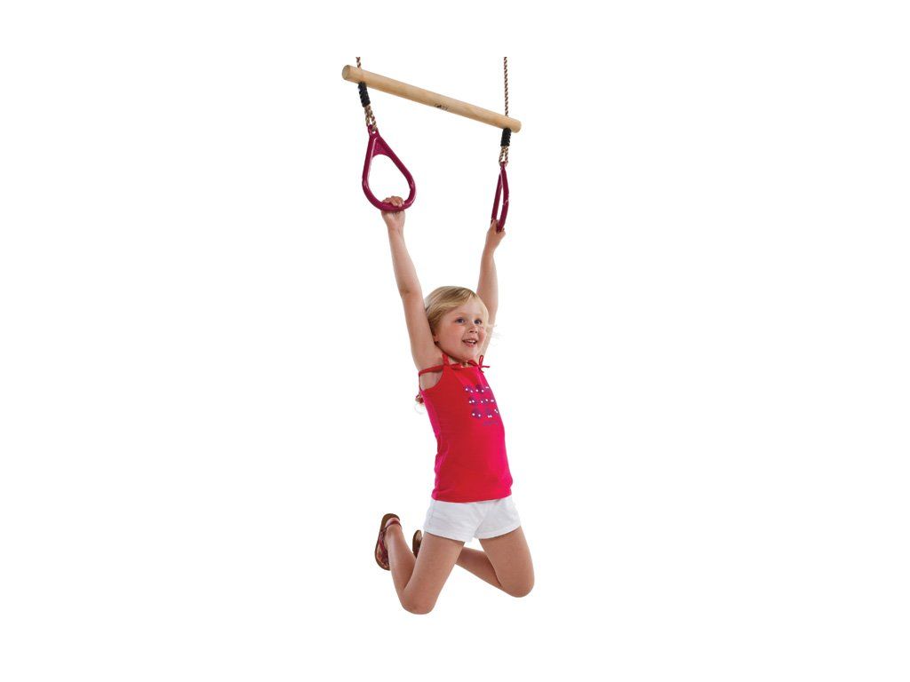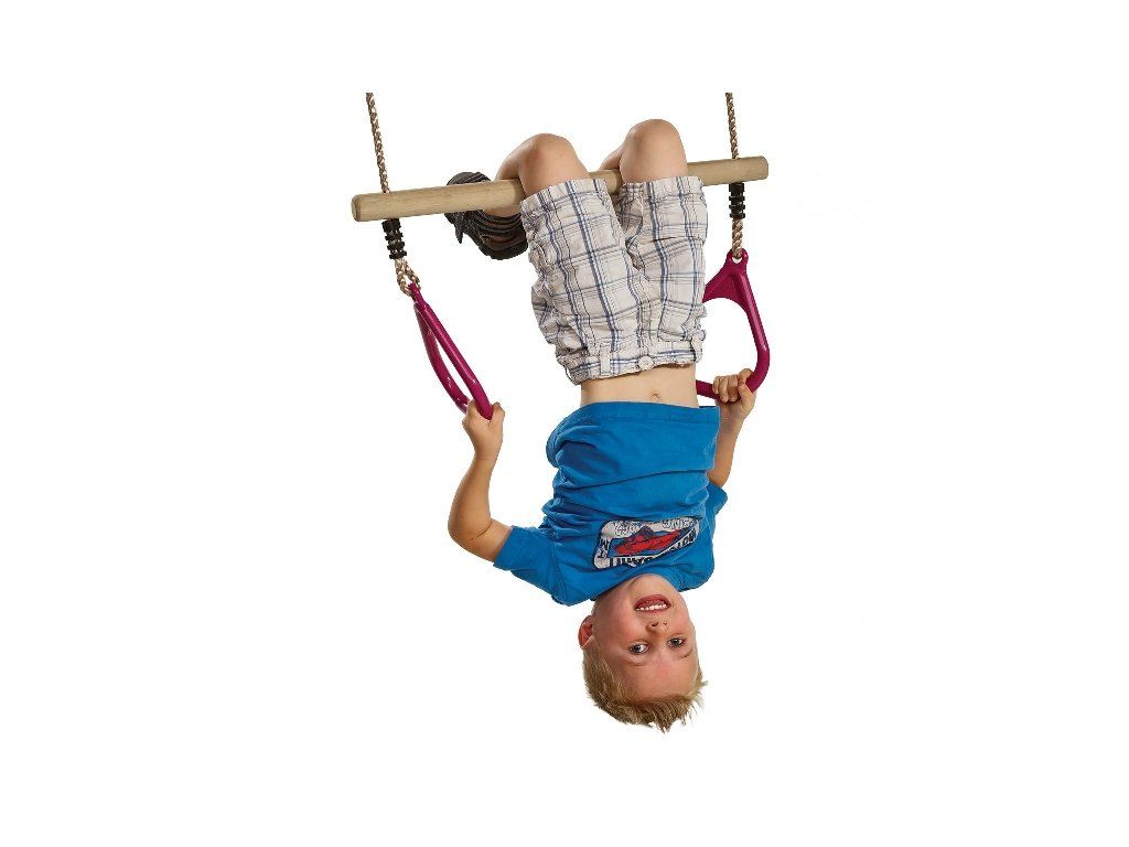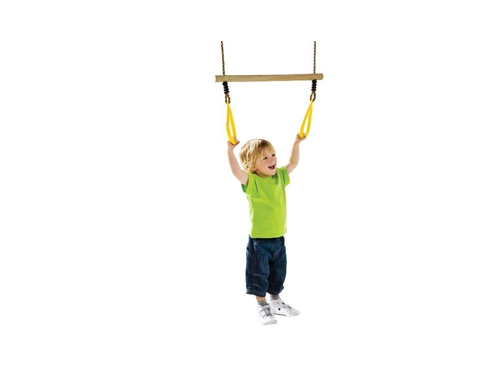 Kombináciou hrazdy s gymnastickými kruhmi vznikne zaujímavý a mnohostranne využiteľný doplnok k veži či hojdačkovému modulu.