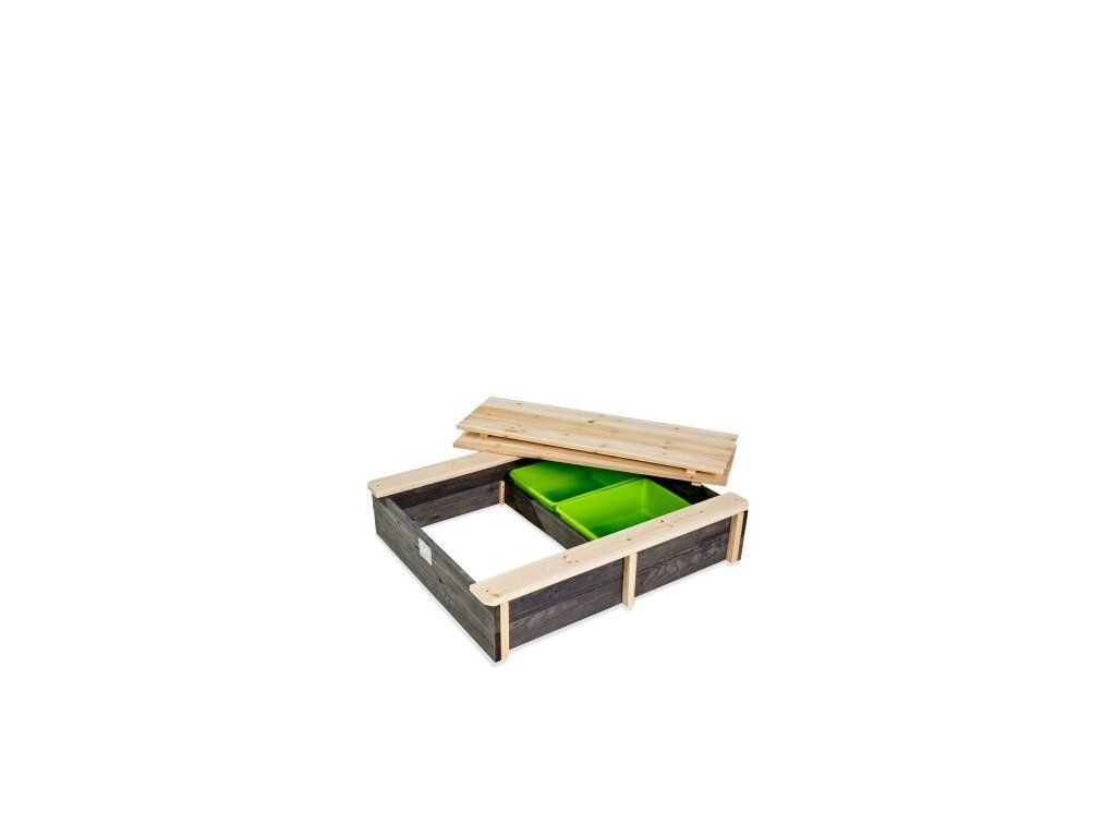 Pieskovisko EXIT Aksent je možné rozdeliť na dve hracie časti, pričom v jednej časti môžu byť umiestnené dve plastové nádoby 2x16l (súčasť balenia), ktoré je v lete možné naplniť vodou a mať tak ešte väčšiu zábavu!! Nádoby možu slúžiť aj ako odkladací priestor pre hračky, príp. je možné ich po hre vybrať a tak ľahko vyčistiť. Ďalšou výhodou pieskoviska EXIT Aksent je, že sa dá po použití uzavrieť krytom, ktorý vďaka pántom ľahko zložíte na polovicu pre ľahšiu manipuláciu. Kryt vám umožňuje udržiavať piesok čistý, suchý a zamädzí prístupu neželaným návštevníkom (mačkám).