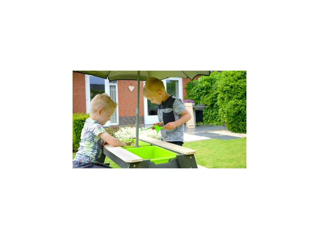 Pod odnímateľnou stolovou doskou sú dve plastové nádoby, ktoré možete naplniť vodou alebo pieskom a tak hru ešte viac zatraktívniť.