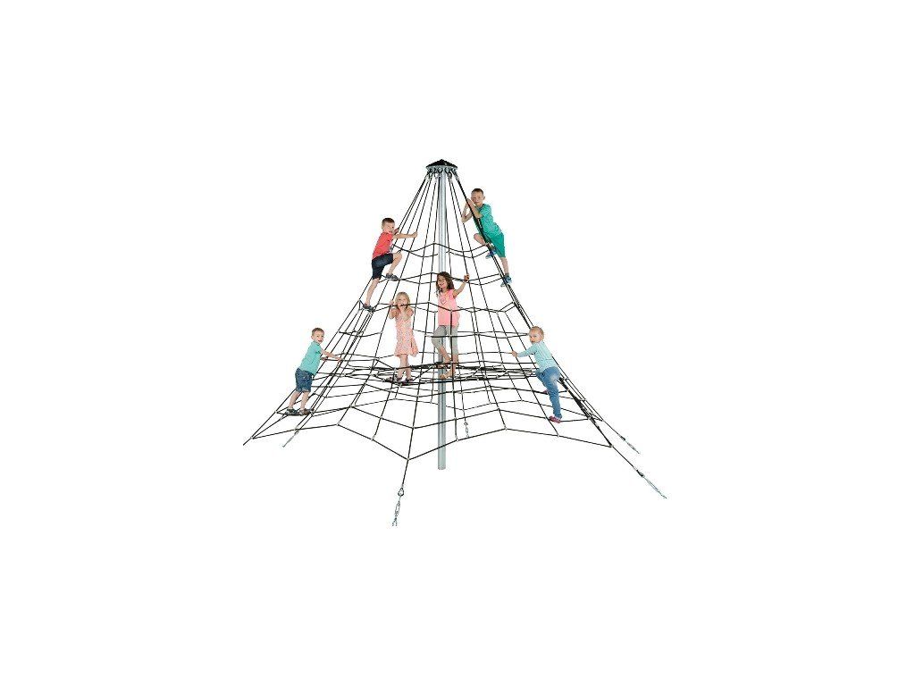 Unikátna KBT lanová pyramídová sieť je 3,5m vysoká a zaručuje hodiny lezenia a s tým spojenej zábavy. Je vyrobená z odolného Ø 16 mm hrubého vystuženého lana s konektormi z tvrdeného plastu, ktoré je možné si zvoliť v rôznych farebných prevedeniach (na vyžiadanie). Lano je štandardne dodávané v čiernej farbe, no na objednávku ho je možné vyrobiť a dodať aj v iných farbách (informujte sa telefonicky alebo mailom). Súčasťou balenia sú i napínacie spony ako i kotviace prvky. Stožiar ako i samotné kotvy je nutné umiestniť do betónového lôžka. Keďže pádová výška je výška najnižšie umiestneného lana zabraňujúceho pádu (čo je menej než 1m), nie je už nutné riešiť protipádovú plochu.