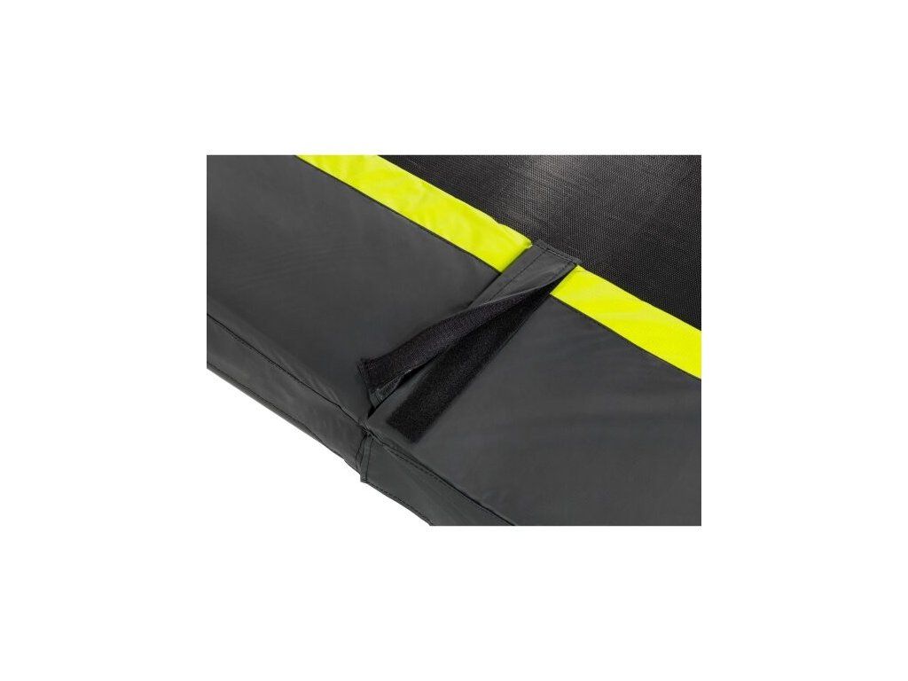 Trampolína sa dodáva v čiernom farebnom prevedení s farebne jasným akcentom vo farbe zelené jablko. Spolu s bezpečnostnou sieťou, ktorá je po celom jej obvode krásne a pevne natiahnutá, stáva sa súčasťou záhradnej architektúry, nenarúša vzhľad okolitého priestoru a nijako neobmedzuje celkový dojem pri pohľade na vašu záhradu. Bezpečnostná sieť má navyše atraktívny výrazný fluoreskujúci zips, takže môžete okamžite zistiť, či je zips správne zatvorený.