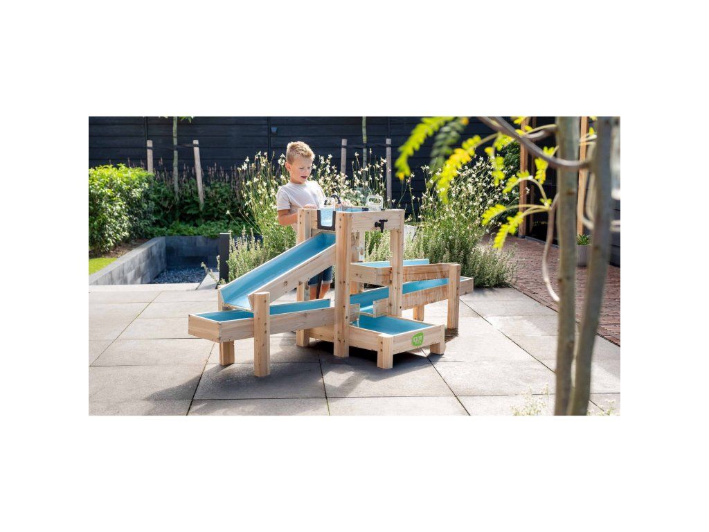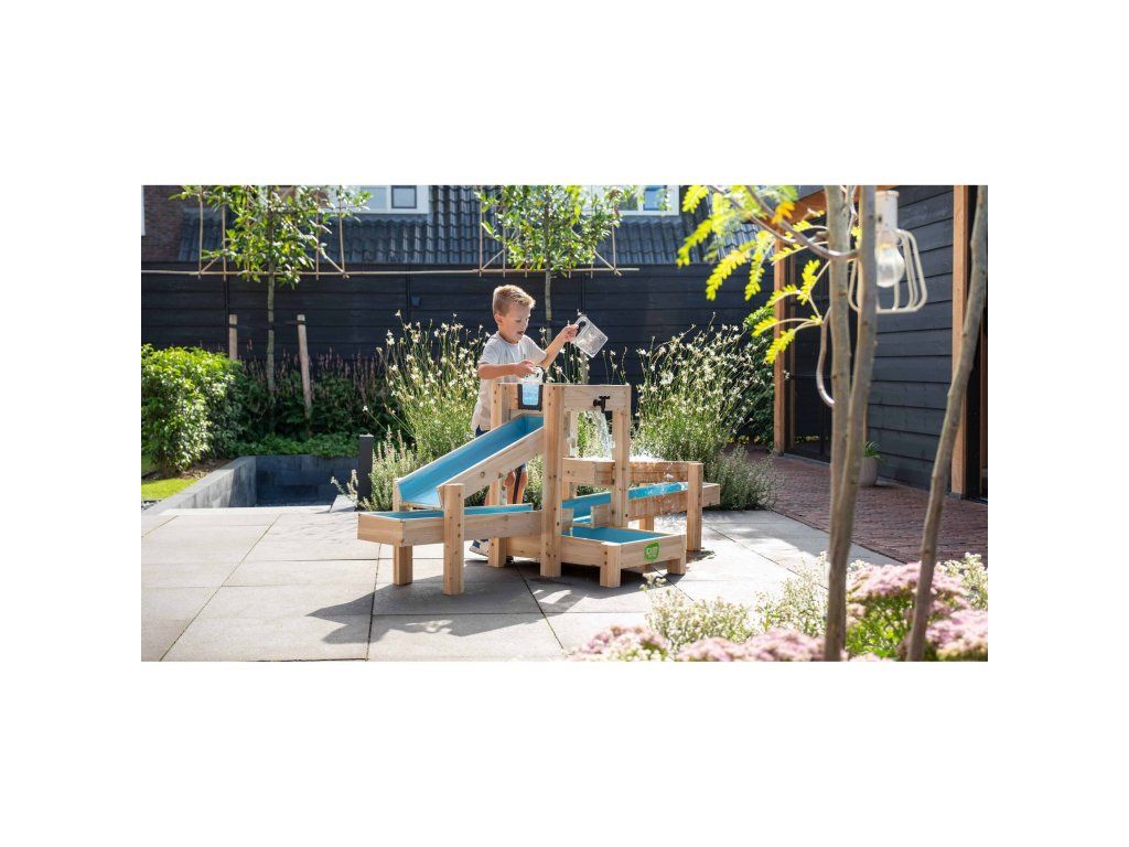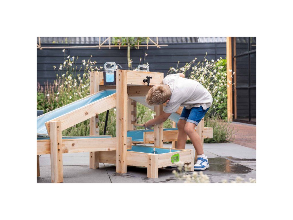 Vodná dráha EXIT AquaFlow 400 je pre každé dieťa zábavou. S touto veľkou vodnou dráhou si deti samy pumpujú vodu, hrajú sa so zámkami a sledujú, ako rýchlo voda preteká dráhami. Od lodičiek až po pingpongové loptičky, do pretekov sa môže zapojiť všetko! S dĺžkou 2,20 metra je táto vodná dráha ideálna do väčších záhrad. A ak sa už skončila sezóna vonkajších hier, vodné nádrže sa dajú kompaktne stohovať. Takto môžete vodnú dráhu jednoducho kdekoľvek uskladniť až do budúceho leta.