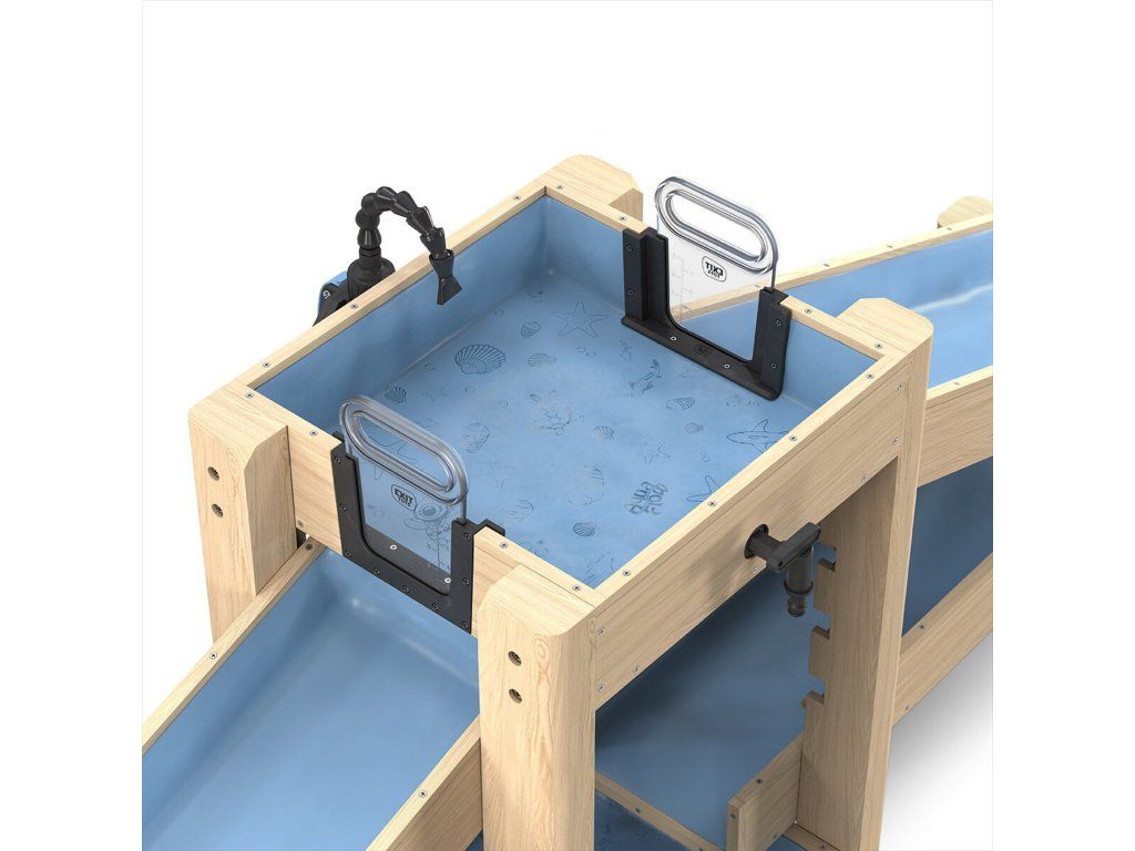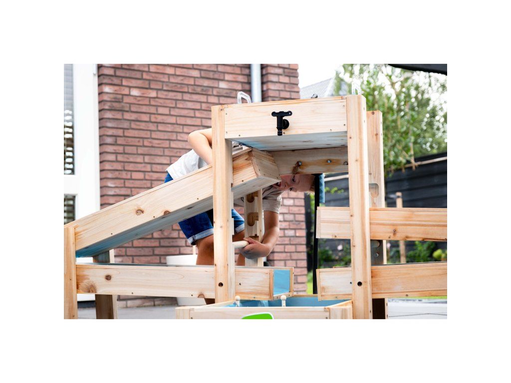 Túto veľkú hračkársku vodnú dráhu robí výnimočnou jednoduchá, ale výkonná ručná pumpa, ktorú deti ľahko ovládajú. To umožňuje deťom hrať sa s vodou bez prerušenia. Vodná dráha má flexibilnú rozprašovaciu hlavicu, ktorá deťom umožňuje ovládať, kam voda tečie. Kombinácia drevenej konštrukcie a pevných, vodeodolných modrých vložiek robí AquaFlow 400 robustným, stabilným a odolným voči roztrhnutiu.