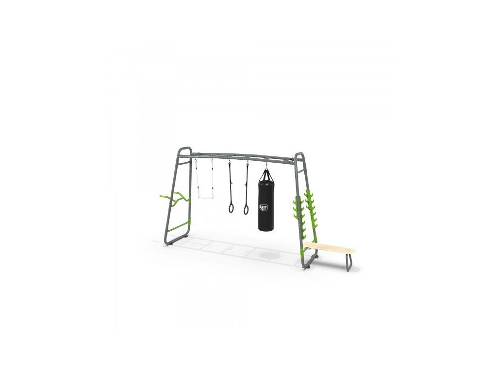 EXIT GetSet MB330 je workout fitness zostava s dĺžkou takmer 5m na vonkajšie použitie. Súčasťou balenia je nasledovné príslušenstvo: klasická hrazda, hrazda na posiľnovanie, gymnastické kruhy, boxovacie vrece, trapéza a posilňovacia lavica, ktoré ponúkajú veľa zábavy a výziev pre športovcov.